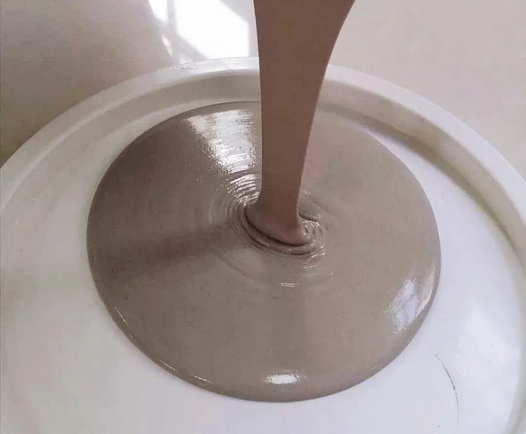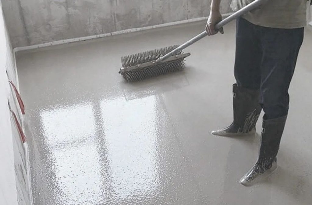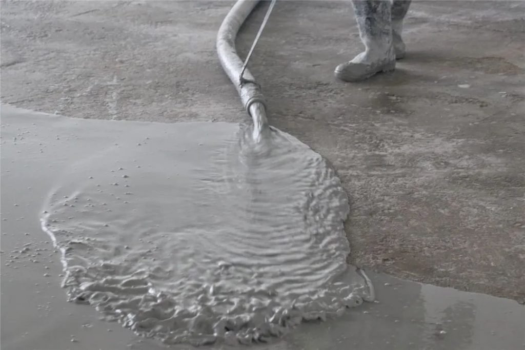 将搅拌好的流态自流平材料在可施工时间内倾侧到基面上,任其像水一样流平开。