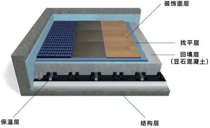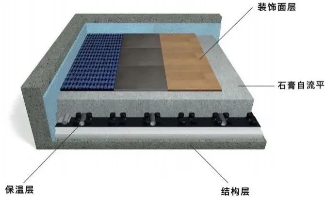 石膏自流平:无需找平层,可减小铺设厚度,总体厚度约为6cm。