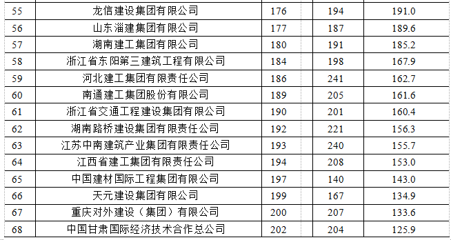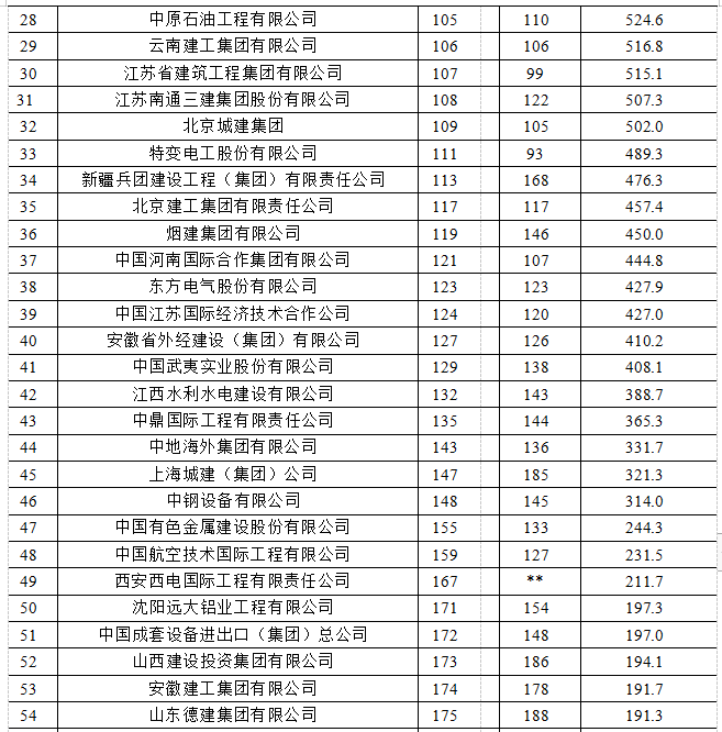从进入榜单企业的排名分布来看,78家内地企业中,进入前10强的仍为3家,分别是中国交通建设集团有限公司排在第4位,中国电力建设集团有限公司排在第7位,中国建筑集团有限公司排在第9位。进入100强的有27家企业,比上年度增加2家。与上年度排名相比,位次上升的有39家,排名保持不变的有6家,新入榜企业6家。排名升幅最大的是前进109位,排名达到第51位的上海电气集团股份有限公司。新入榜企业中,排名最前的是排在第167位的西安西电国际工程有限责任公司(表1)。