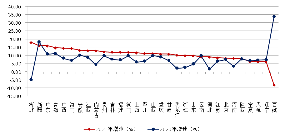从各地区建筑业总产值增长情况看,除西藏外,各地建筑业总产值均保持增长,25个地区的增速高于上年。湖北、新疆、广东、青海和广西分别以17.94%、16.03%、15.82%、14.66%和14.46 %的增速位居前五位(图15)。
