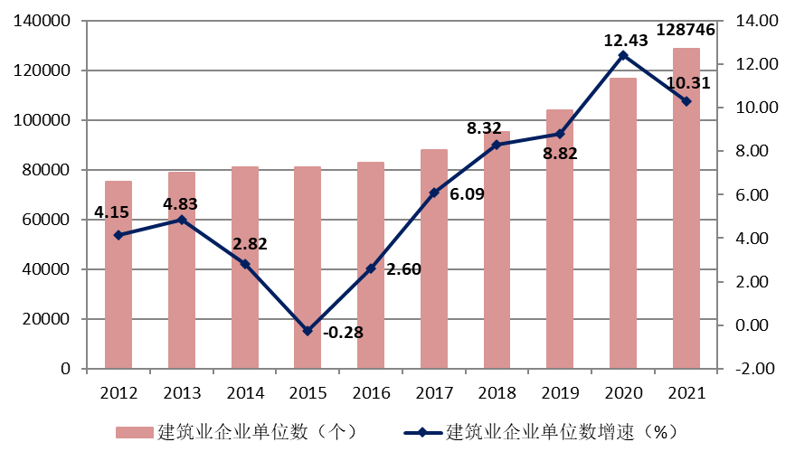 全国建筑业企业(指具有资质等级的总承包和专业承包建筑业企业,不含劳务分包建筑业企业,下同)完成建筑业总产值293079.31亿元,同比增长11.04%;完成竣工产值134522.95 亿元,同比增长10.12%;签订合同总额656886.74亿元,同比增长10.29%,其中新签合同额344558.10亿元,同比增长5.96%;房屋施工面积157.55亿平方米,同比增长5.41%;房屋竣工面积40.83亿平方米,同比增长6.11%;实现利润8554亿元,同比增长1.26%。截至2021年底,全国有施工活动的建筑业企业128746个,同比增长10.31%;从业人数5282.94万人,同比下降1.56%;按建筑业总产值计算的劳动生产率为473191元/人,同比增长11.89%。