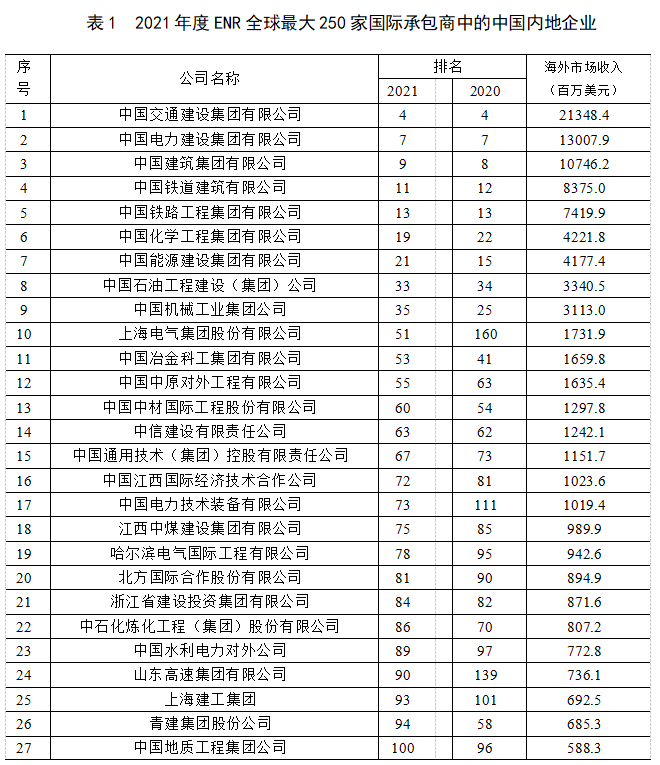 美国《工程新闻记录》(简称“ENR”)杂志公布的2021年度全球最大250家国际承包商共实现海外市场营业收入4203.2亿美元,比上一年度减少了11.1%。我国内地共有78家企业入选2021年度全球最大250家国际承包商榜单,比上一年度增加了4家。入选企业共实现海外市场营业收入1074.6亿美元,比上年度收入合计额减少10.5%,降幅略低于250 强企业总体海外收入的缩减幅度,收入合计占250家国际承包商海外市场营业收入总额的25.6 %,比上年微增0.2个百分点。
