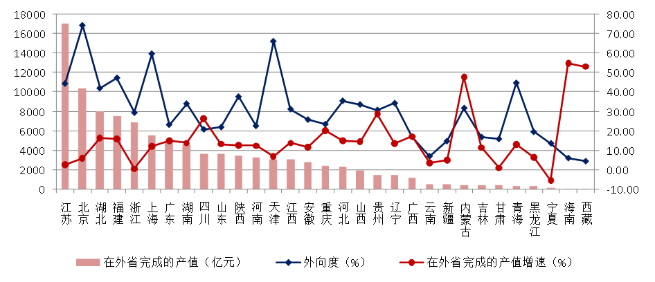 图17  2021年各地区跨省完成的建筑业总产值及外向度