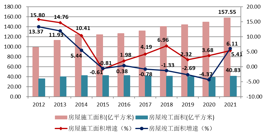 图11  2012-2021年建筑业企业房屋施工面积、竣工面积及增速