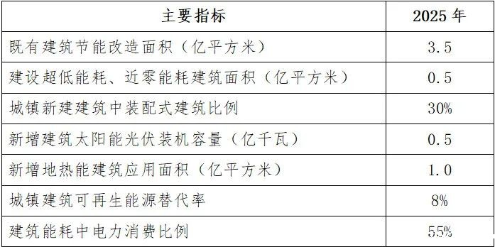 2.具体目标。到2025年,完成既有建筑节能改造面积3.5亿平方米以上,建设超低能耗、近零能耗建筑0.5亿平方米以上,装配式建筑占当年城镇新建建筑的比例达到30%,全国新增建筑太阳能光伏装机容量0.5亿千瓦以上,地热能建筑应用面积1亿平方米以上,城镇建筑可再生能源替代率达到8%,建筑能耗中电力消费比例超过55%。