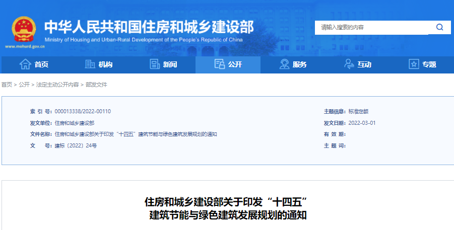 2022年3月11日,住建部发布《“十四五”建筑节能与绿色建筑发展规划》提出,到2025年,城镇新建建筑全面建成绿色建筑,建筑能源利用效率稳步提升,建筑用能结构逐步优化,建筑能耗和碳排放增长趋势得到有效控制,基本形成绿色、低碳、循环的建设发展方式,为城乡建设领域2030年前碳达峰奠定坚实基础。