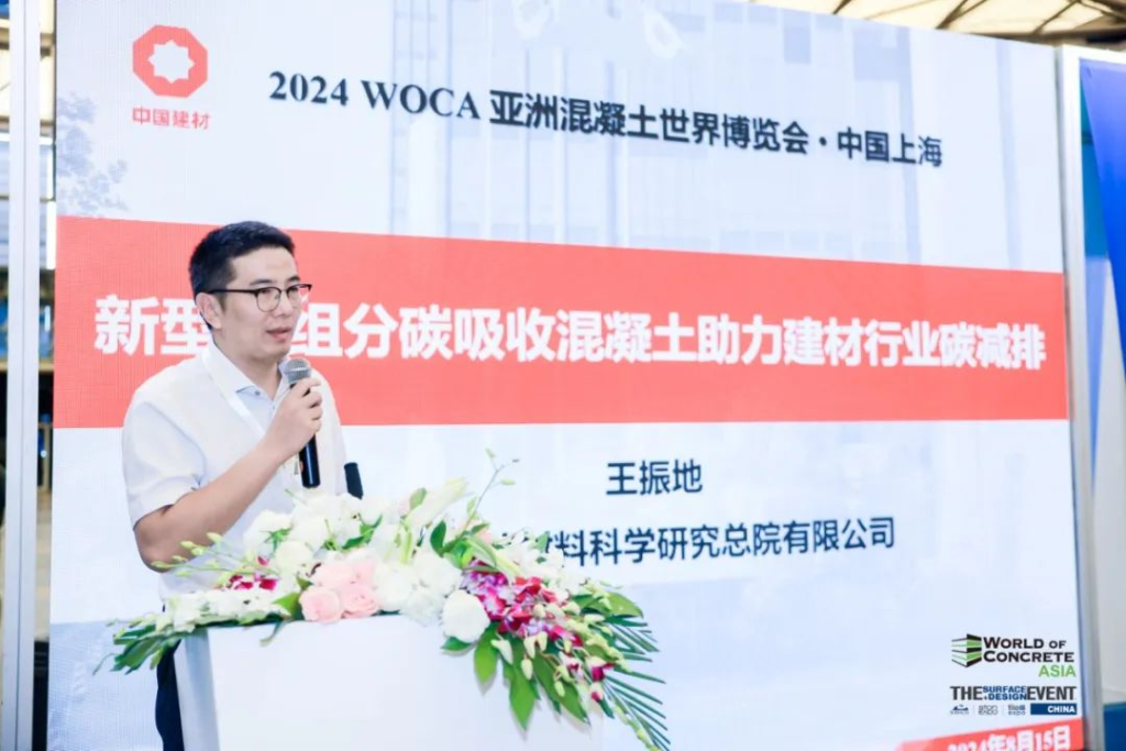 会上,中国建筑材料科学研究总院有限公司的所长王振地以其深厚的专业背景和前瞻性的视角,为大家带来了关于“新型全组分碳吸收混凝土”的精彩演讲。王所长详细介绍了该材料的研发背景、技术原理及在建材行业碳减排中的重要作用。