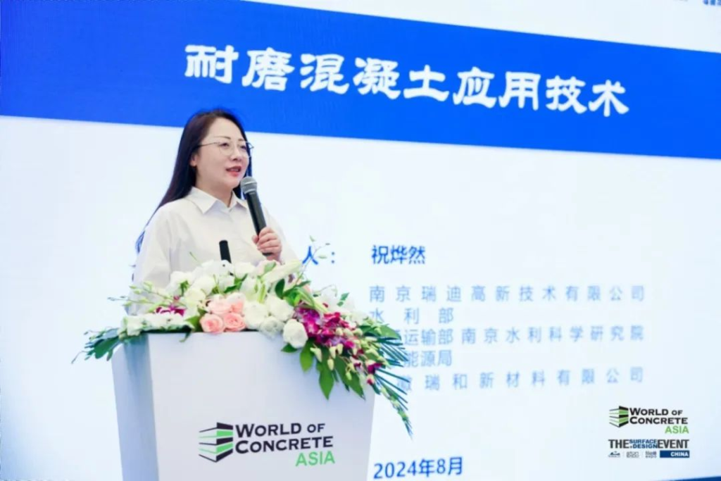 南京瑞迪高新技术有限公司总经理祝烨然女士为与会者介绍了耐磨混凝土的应用技术。祝总从耐磨混凝土的原材料选择、配合比设计、施工工艺等方面进行了全面讲解,并分享了该技术在多个领域的应用实例。