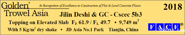 金镘刀奖-亚洲区Golden Trowel Asia (以下简称GTA)的报名自2025年4月份正式开始,报名对象为亚洲地区所有地坪施工企业。能参与本年度金镘刀奖-亚洲区评选的地坪项目应符合大于900平方米(狭小带≤6.6米宽,大于700平方米)。并可于2025年9月1日之前完工,9月1日之后完工的项目可参与下一年度的评选。目前开始接受各企业的报名咨询,咨询方式:+1(757)624-2121 或邮件至Dipstick@Faceco.com(邮件名称请务必包含“咨询金镘刀奖-亚洲赛区”字样,谢谢!)报名截止日期:2025年9月30日。