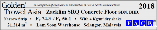- 马来西亚Zacklin SRQ Concrete Floor SDN.SHD. 所负责的“Lam Soon Warehouse Selangor, Malaysia“获得整平机楼面大面积施工类(耐磨类)银奖