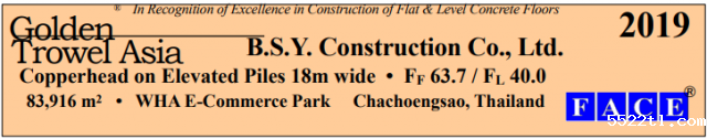 - 泰国曼谷的B.S.Y. Construction Co., Ltd.所负责的“泰国北柳府WHA 电子商务园区”获得桩承地坪施工类金奖