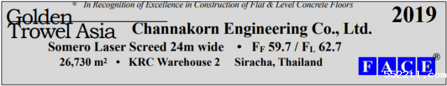 - 泰国曼谷的The Concrete Products and Aggregate Company所负责的“泰国Siracha港口2号仓库”获得激光整平机大面积施工类银奖
