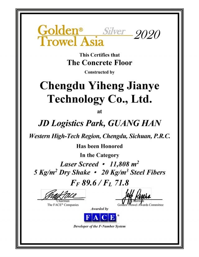 - 重庆恒特地坪工程有限公司——德邦物流西南总部基地——总承包商:江苏天力建设集团有限公司——项目管理:捷越工程咨询(上海)有限公司(金镘刀奖-亚洲区金奖)