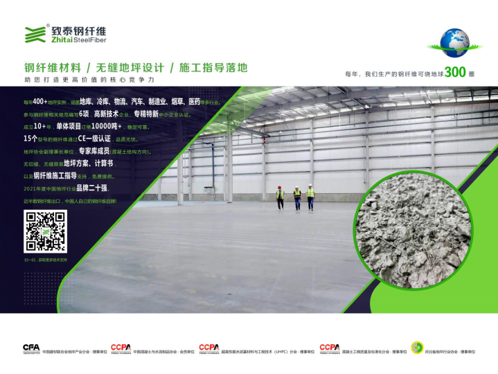 致泰钢纤维是地坪协会理事单位,拥有专家库成员(混凝土结构方向),可提供无切缝、无缝限裂地坪方案、计算书,以及钢纤维施工指导支持。
