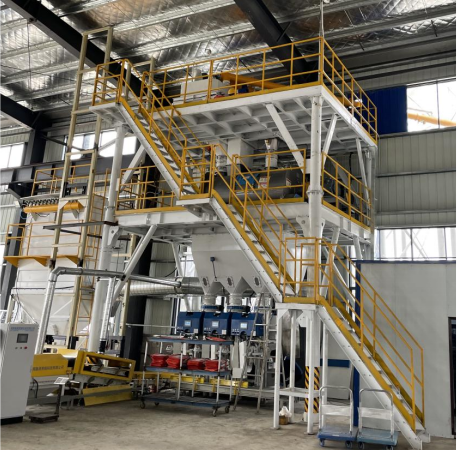 石膏砂浆生产线主要用于生产新型墙体抹灰材料石膏砂浆,是以半水石膏为基材,与无机材料混合搅拌支持轻质石膏砂浆及重质石膏砂浆的大规模批量连续式生产作业。该线生产过程中平稳高效、生产环境清洁友好,各种物料如石膏粉、玻珠、砂、钙粉、添加剂等短时间内即可充分混合均匀,混合动作柔和高效,保证玻珠等各种物料性状稳定一致,以确保石膏砂浆功能优势在后期施工过程中完美呈现。