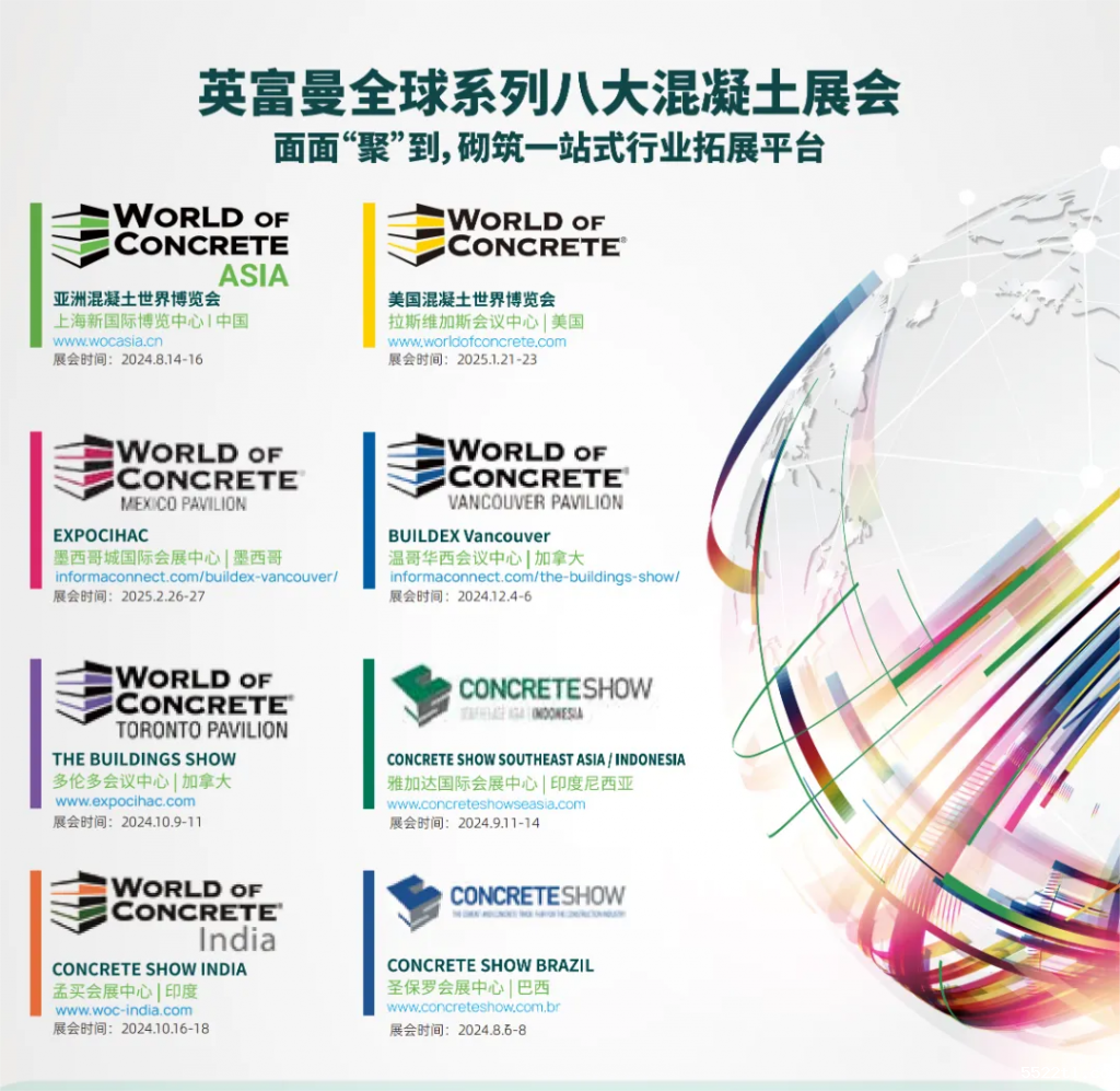 WOC系列全球共有八大展会,该系列第一个展会创立于1975年,由英富曼集团主办,历经近50年的积淀和发展,WOC展览会已成为全球商用混凝土及砌筑行业专业展览会,品牌已拓展至美国、中国、墨西哥、加拿大、巴西、印度和印尼等全球各地。
